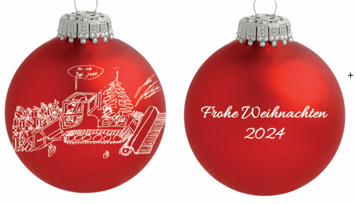 Die Kugel in mattrotem Design ziert ein von ihm gemaltes Weihnachtsmotiv und ist hand-signiert – ein echtes Sammlerstück für Freunde und Förderer des Lions Club Freiburg. Das Motiv, das Mutzke für die matt rote Kugel gewählt hat, ist eine Schneeräumungsmaschine – eine persönliche Hommage an seine Heimatverbundenheit und sein ehrenamtliches Engagement im Schwarzwald.